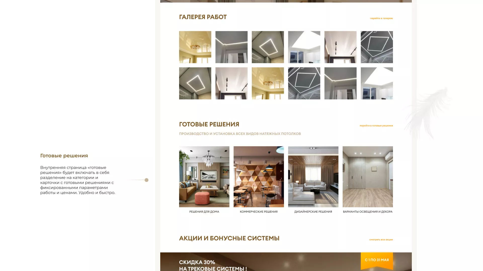 Что мы сделали. Разработали сайт в теплых и уютных «шоколадных» тонах. Продумали структуру, наполнили ее удобными разделами такими как «готовые решения», которые включают в себя не только уже готовые варианты с фиксированной ценой, но и разделение по категориям: решения для дома, коммерческих помещений, интересные дизайнерские решения. Так же предложили клиенту онлайн-калькулятор, что может существенно упростить потенциальным заказчикам нашего клиента в Кудрово заказ потолков.