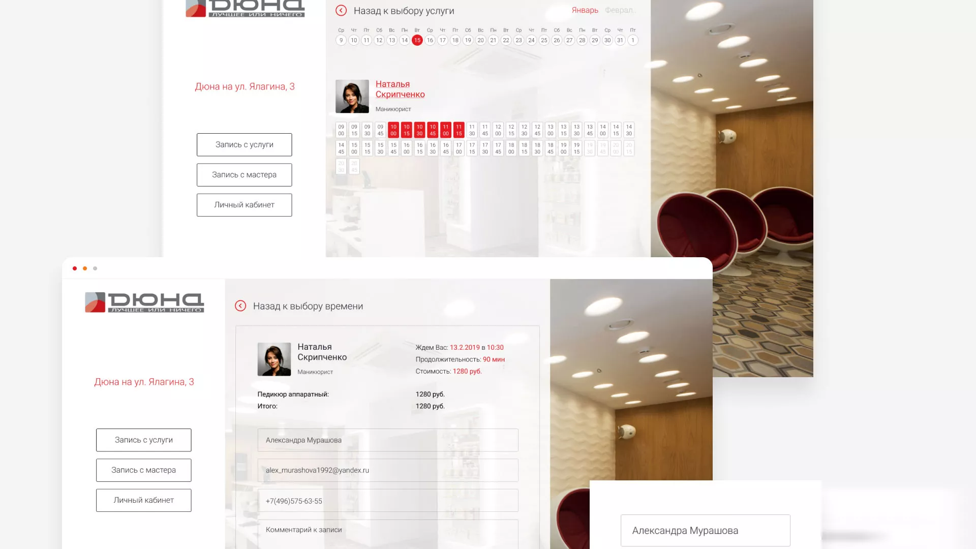 В разделе «Личный кабинет» содержатся все текущие записи в салоны красоты в Кудрово, с возможностью их отмены. Также, здесь можно редактировать свои персональные данные, ознакомиться с историей записей и видеть бонусы и акции салонов красоты.